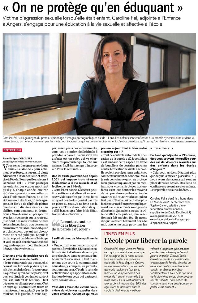 Angers L’adjointe au maire Caroline Fel : « On ne protège qu’en éduquant », le Courrier de l’Ouest, le 9 octobre 2018